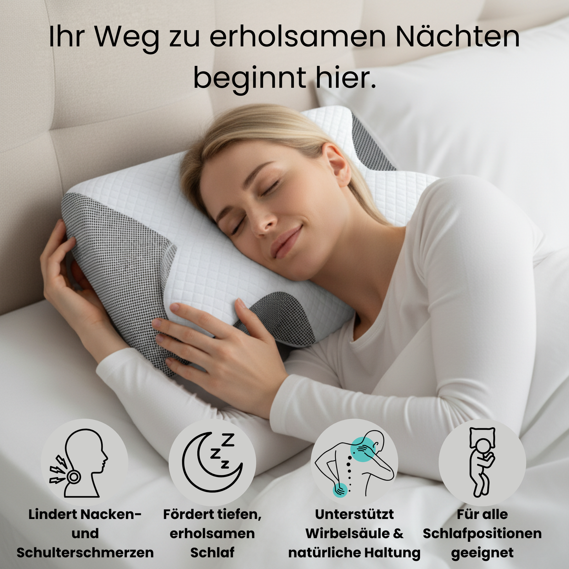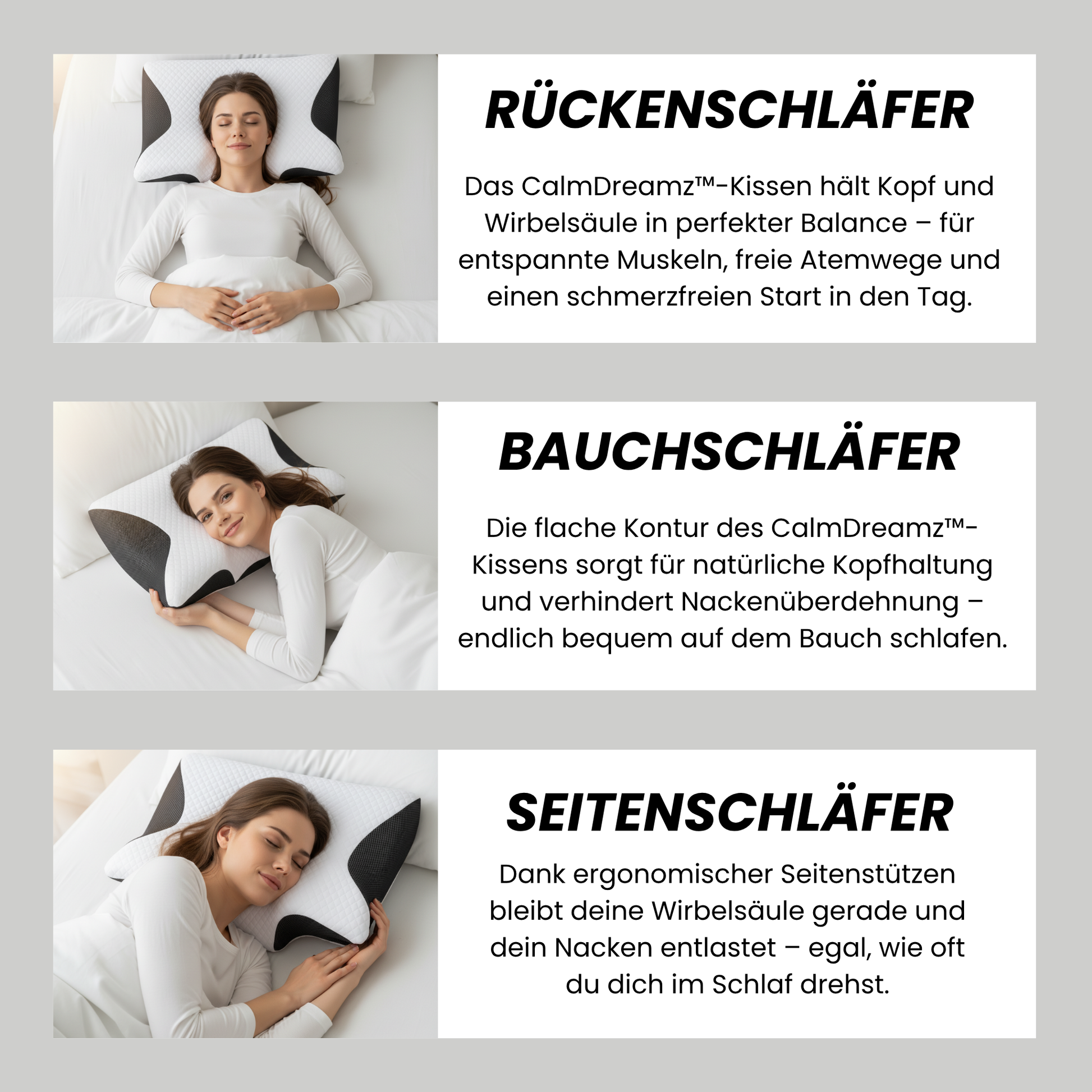 Denken Sie voraus mit CalmDreamz™: Für erholsamen Schlaf heute und einen schmerzfreien Rücken morgen. Bewahren Sie Ihre Wirbelsäulen-Neutralität und beugen Sie Haltungsschäden vor – für erwachte Erholung und verbesserte Körperhaltung